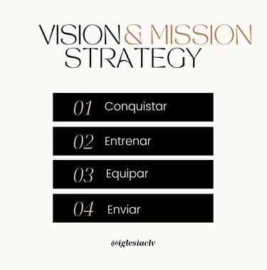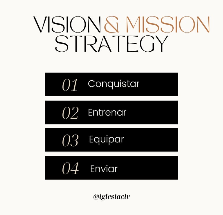 Somos una iglesia que abraza con valentía su identidad de “conquistados para conquistar”, viviendo transformados por el amor y la gracia de Dios. Guiados por el Espíritu Santo, buscamos conquistar, entrenar, equipar y enviar a cada creyente para establecer el Reino de Dios y que puedan funcionar según el propósito eterno de Dios para sus vidas. Nuestra pasión es formar discípulos que adoren, oren, crezcan en la Palabra y vivan en comunión, siendo enviados como conquistadores que proclaman el evangelio de Jesucristo con poder, trayendo salvación, sanidad y liberación. A través de acciones de justicia, compasión y amor, impactamos nuestra sociedad y extendemos la verdad de Cristo al mundo.